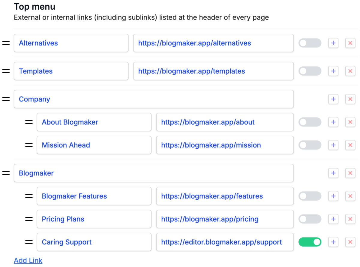 If you already have a Top Menu on your Blogmaker blog, you can add a submenu to it by going to "Settings > Custom Menus" —— where you can also add your Top Menu, if you haven't already.