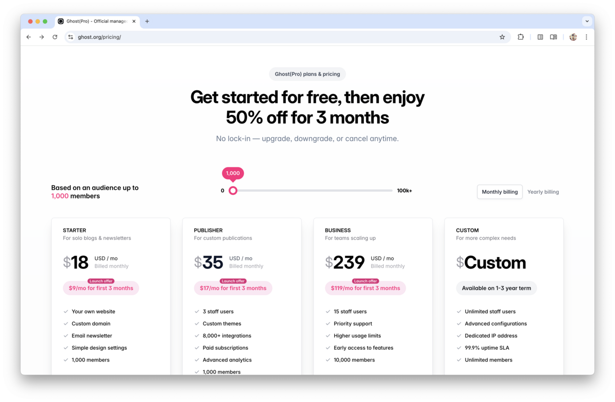 Ghost offers three basic pricing tiers and a Custom one which is offered in 1–3 year terms, and it's geared towards complex use cases, such as online news outlets.