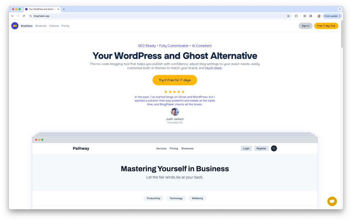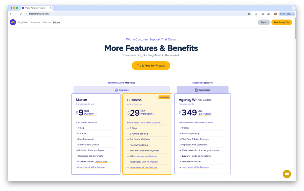 BlogMaker is a modern blogging tool that helps users create their blog with ease and modify its settings to match their brand or existing websites. The feature set is everything you'd expect from an advanced blogging tool and more. One benefit of using BlogMaker is that it's as simple or advanced as you need it. Meaning that the dashboard and the editor is clean in essence, but it has a lot of extra tools for the advanced user. BlogMaker offers three clear pricing plans designed for different levels of users. The Starter plan costs $9/month and includes one blog, one author, a free subdomain, domain connection, unlimited posts and pages, a dedicated SSL certificate, and access to DesignStudio for theme customization. The Business plan, labeled as the best value at $29/month, expands on this with up to five blogs, three authors per blog, full on-site SEO tools, priority monitoring, a Post API, /subdirectory hosting, and built-in analytics. For larger teams or agencies, the Agency White Label plan is priced at $349/month, providing ten blogs, five authors per blog, pillar page and topic structure, WordPress migrations, white-label hosting, priority support, and hands-on assistance.Pros
