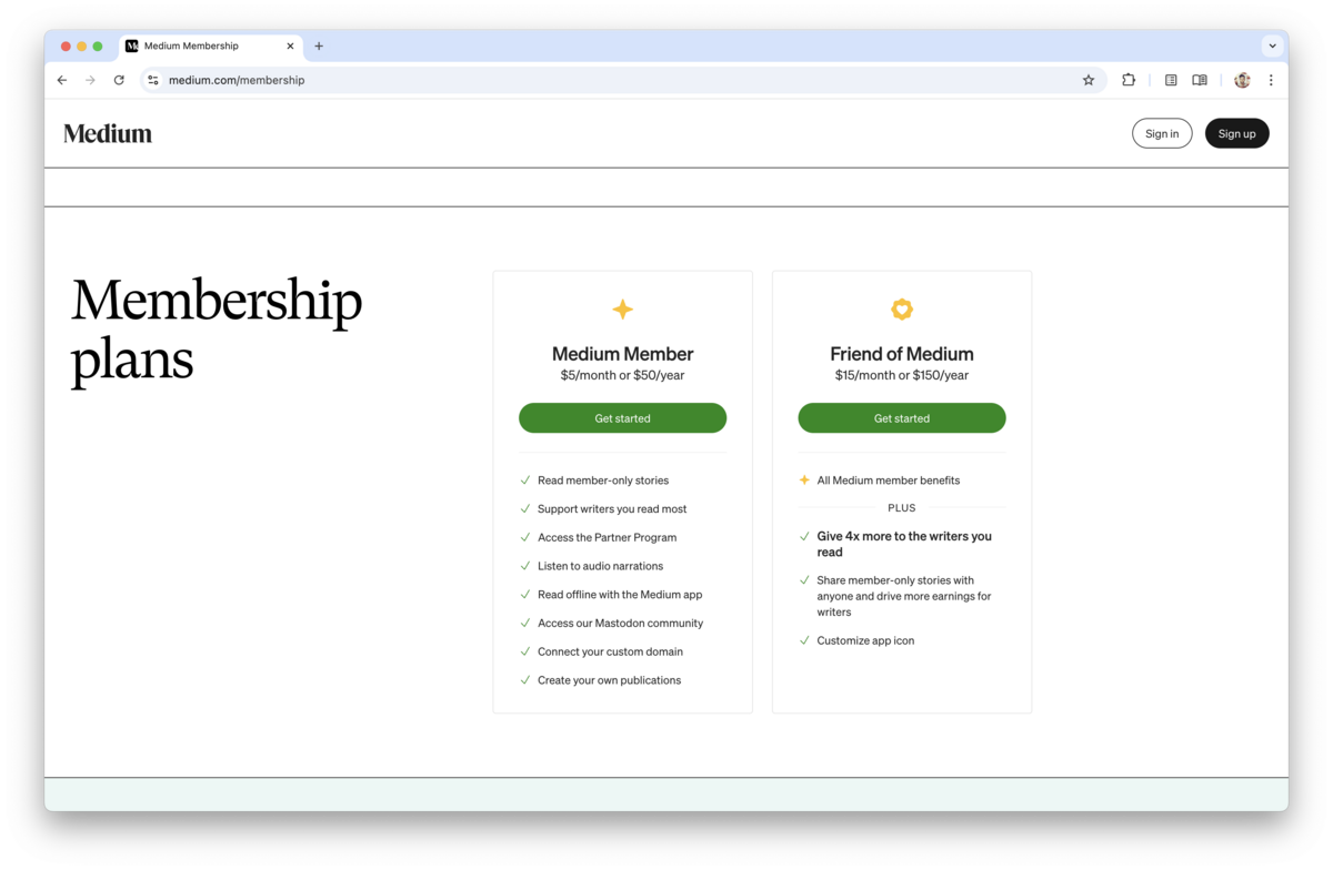 The prices below are for readers only, and here's a little caveat: on Medium, your posts live inside their ecosystem. If you join their Partner Program, your posts automatically go behind a paywall (though you can choose to make some free), and then Medium decides which of your posts to promote and recommend. If you don't join their Partner Program, your posts are not promoted as much and won't appear in recommended articles.